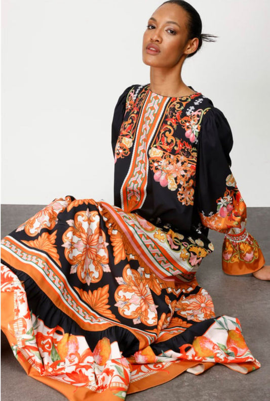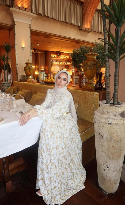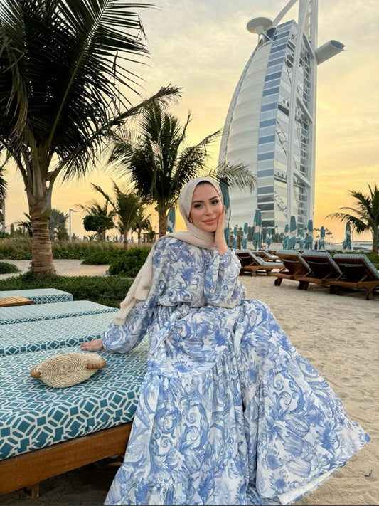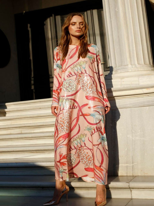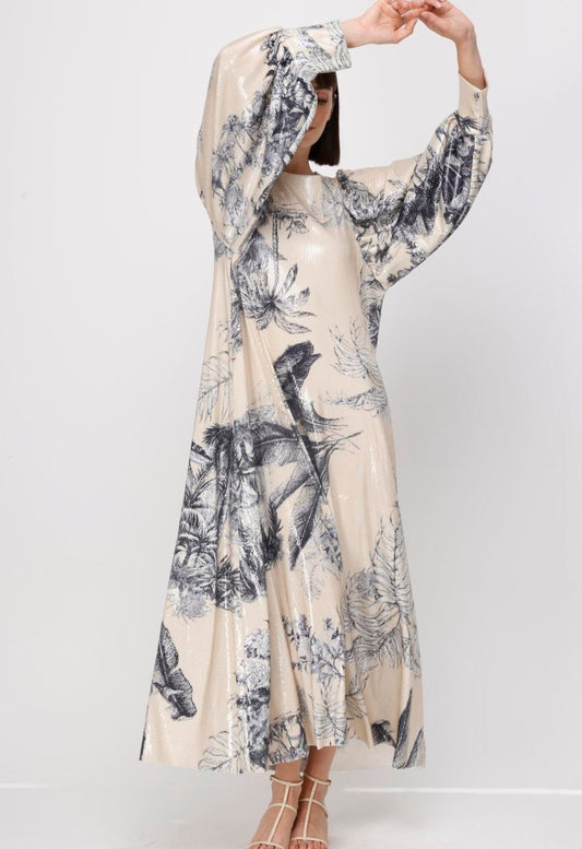 SEQUIN PALM TREE HOUSE PATTERN BALLOON SLEEVE MAXI LONG DRESS!