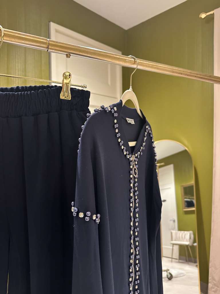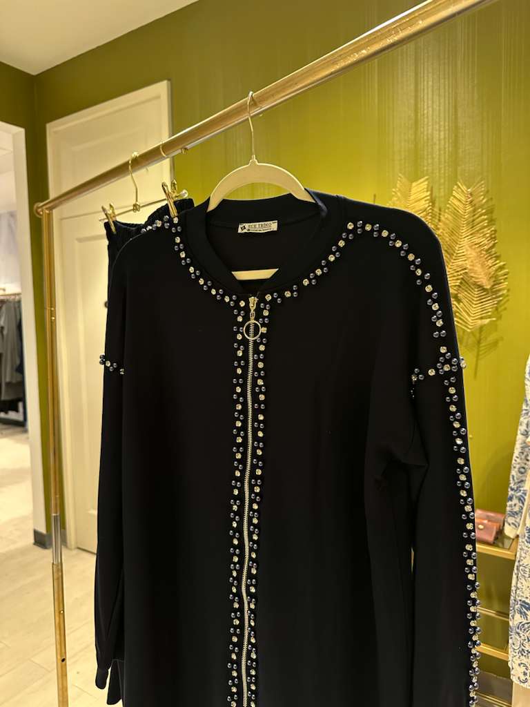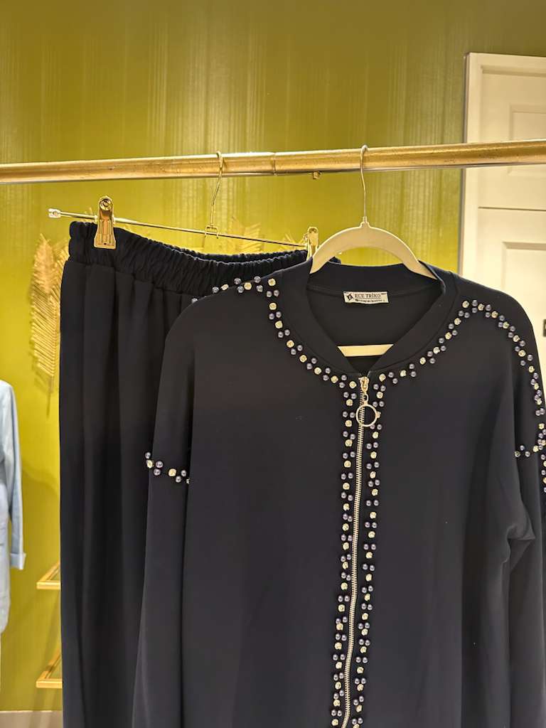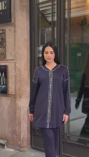 Elevate your everyday style with this chic and comfortable Crystal Edge Luxe Co-Ord Set. Designed in a rich midnight-black fabric, this two-piece ensemble features a relaxed-fit top adorned with sparkling crystal embellishments along the neckline, zipper line, and sleeves—adding just the right touch of glamour. The matching pants come with a soft elastic waistband for an effortless, flattering fit.