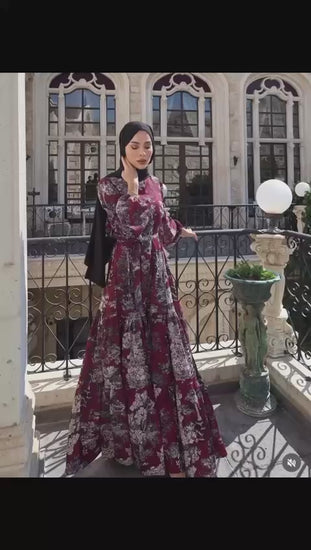 It features an intricate, all-over print, possibly a toile or scenic pattern, in contrasting colors like off-white, beige, and dark grey.