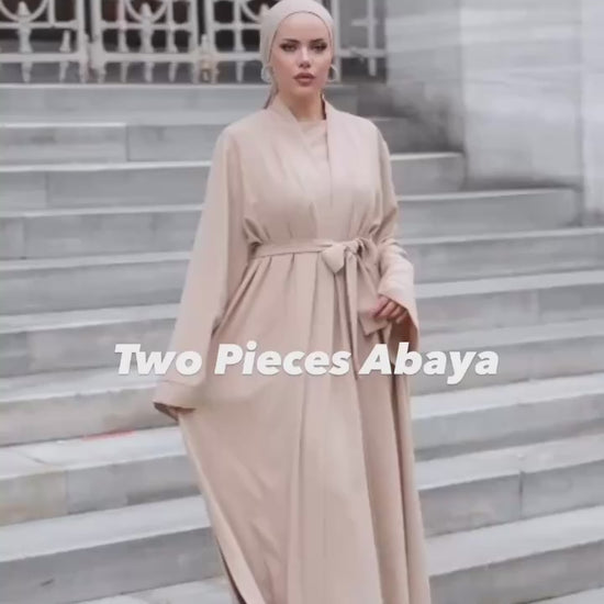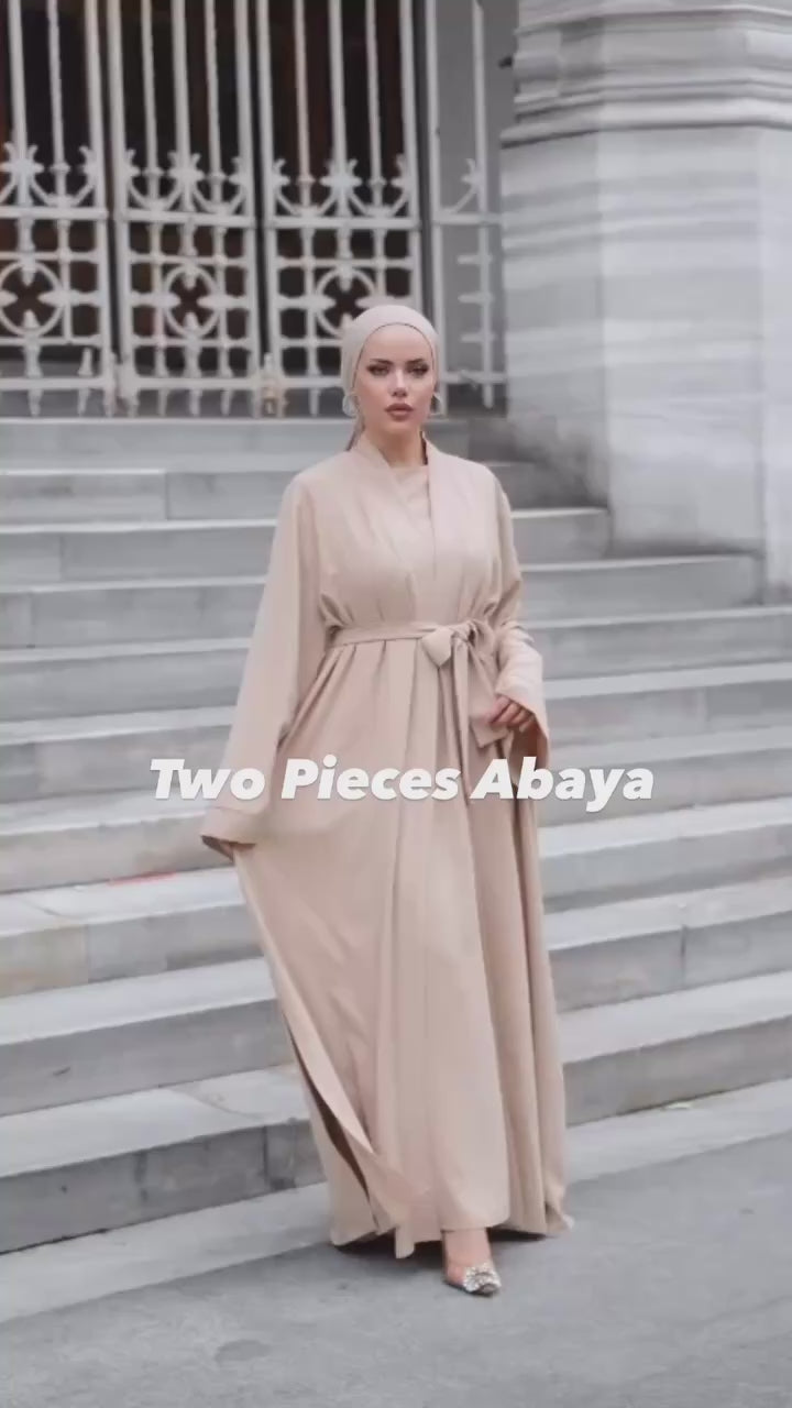 Elevate your wardrobe with this elegant two-piece modest set, featuring a simple inner dress paired with a flowing belted abaya. Designed for versatility and comfort, the adjustable waist tie enhances your silhouette while maintaining a modest, graceful look.